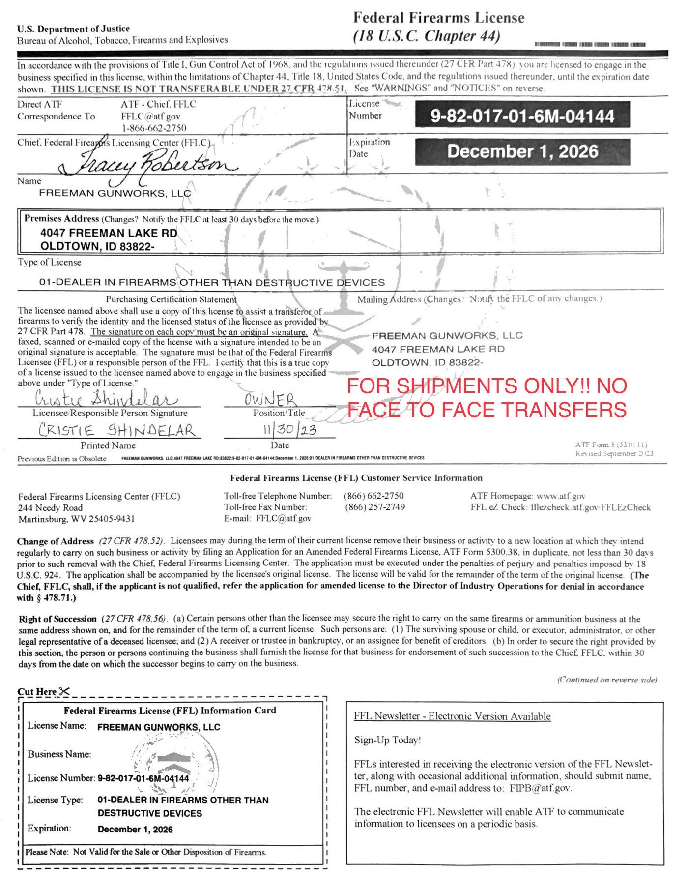 If you are a dealer ready to ship firearms to FreeMan GunWorks for transfer, please click on the button below for a copy of our Federal Firearms License.